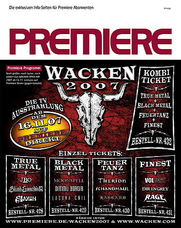 Wir freuen uns euch mitzuteilen, dass ab dem 16.11.07 Aufzeichnungen vom diesjährigen W:O:A bei PREMIERE Direkt ausgestrahlt…