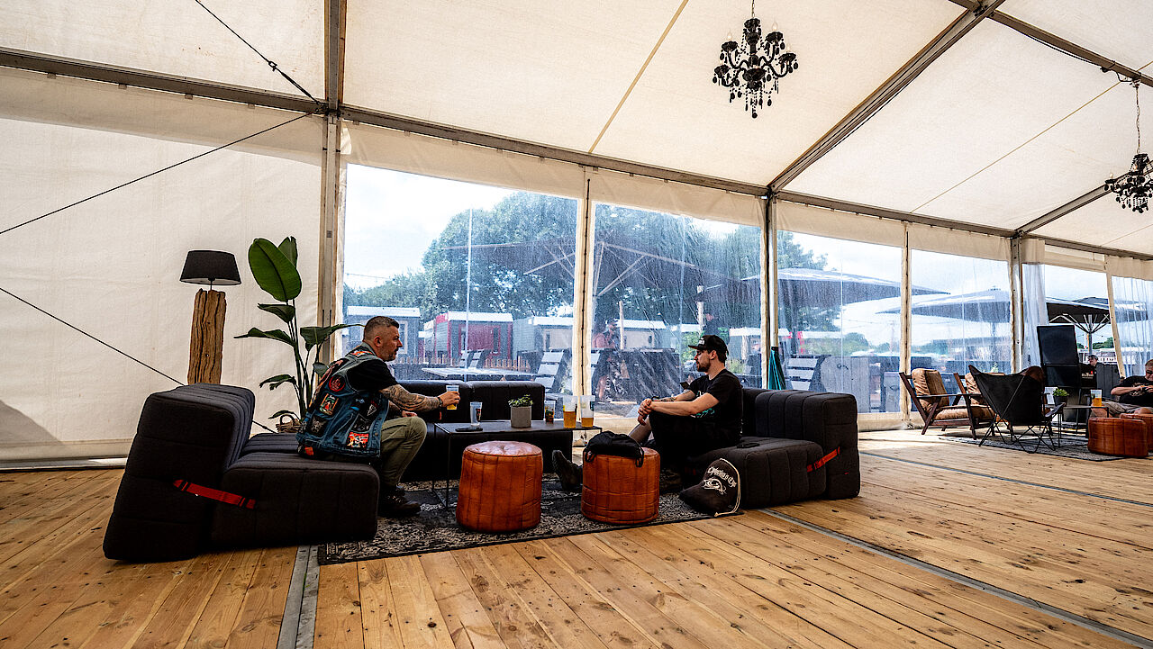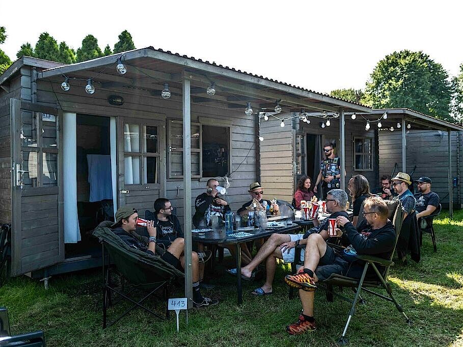 Dann ab mit euch in dieses robuste Teil. Ca. 2,40 breit und ca. 3 Meter lang ist die Lodge. Das sollte ebenfalls für zwei Metalheads reichen!