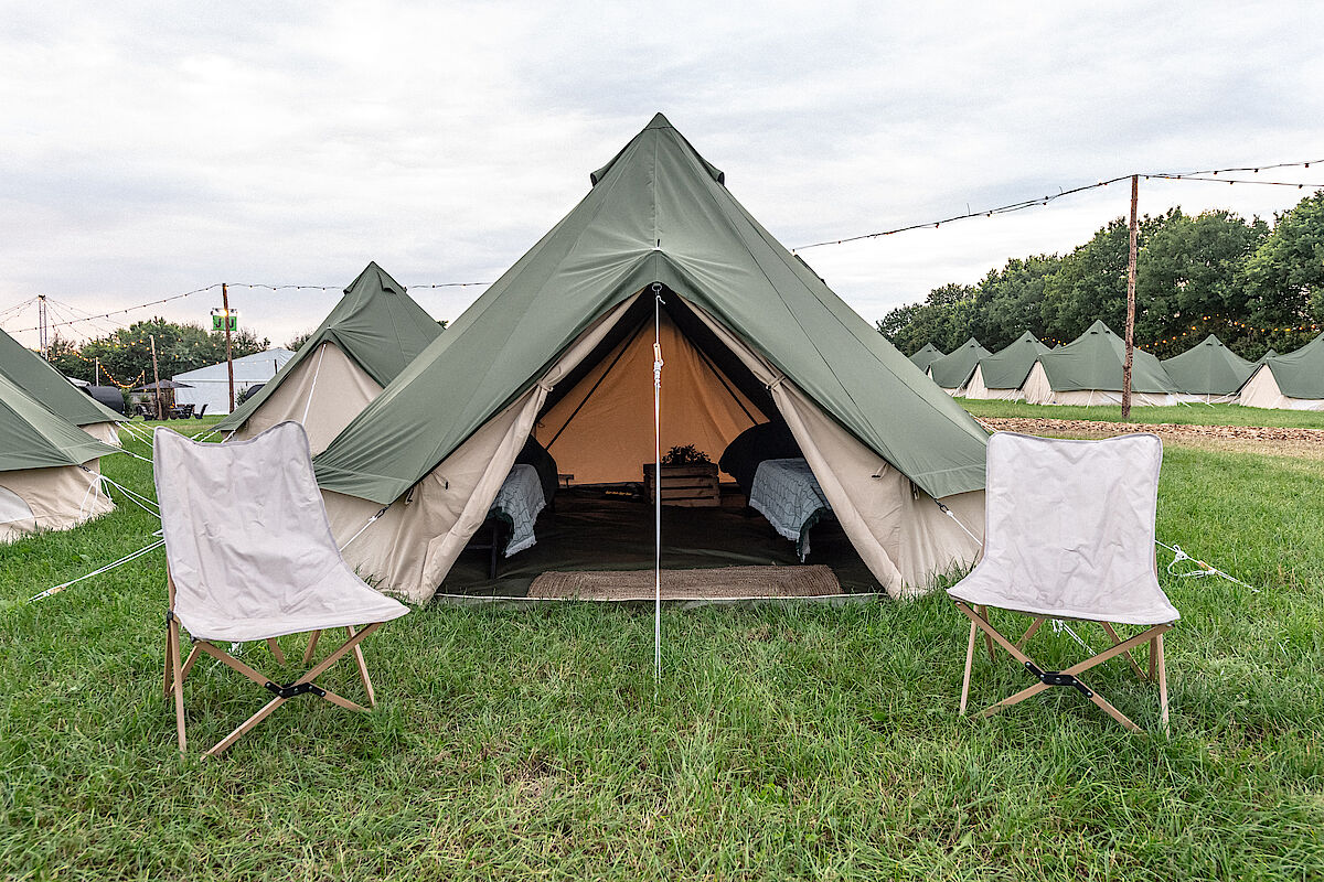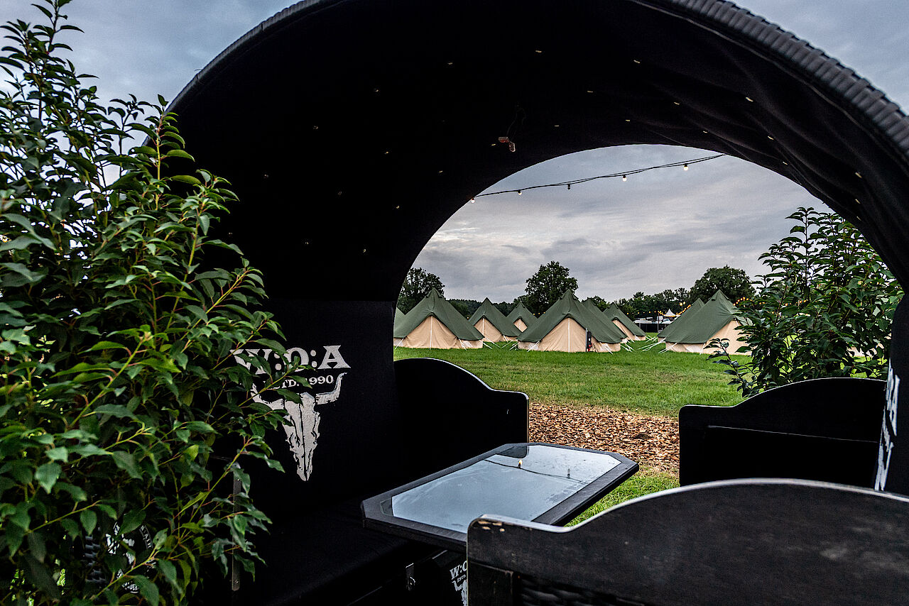 2025 in die Residenz Evil-Familie aufgenommen – Hells Bell Lite: 4 Meter Durchmesser, 2,50 Meter hoch, keine Zeltstange in der Mitte. Somit ausreichend Platz für Zwei. Ansonsten ist die Ausstattung genauso wie in den weiteren Hells Bell Zelten. Es ist alles da, was ihr braucht: Betten, Decken, Kissen, Tagesdecke und Sitzgelegenheiten für bis zu zwei Personen.