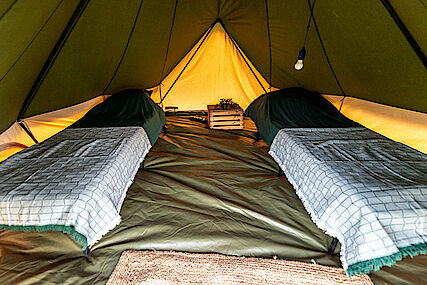 Kein Ding. Bei Hells Bell (mit ca. 5 Metern Durchmesser und einer Höhe von 3,50 Meter) finden zwei von euch Platz. Auch hier gibt´s Betten, Decken, Kissen, Tagesdecke und Sitzgelegenheiten.