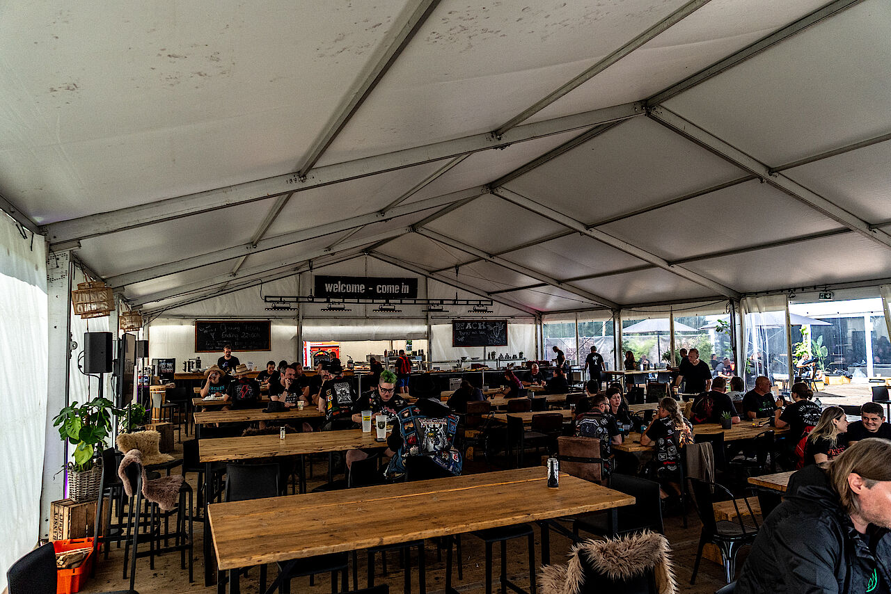 Beim Cathedral-Zelt ist der Name Programm: ca. 6 x 4 Meter Grundfläche, ca. 3 Meter Höhe. Sechs Metalheads finden hier locker Platz, und durch die zwei Mittelpfosten kann der Raum auch effektiv genutzt werden. Die Betten und Ausstattungen sind genauso wie in den Kategorien zuvor.